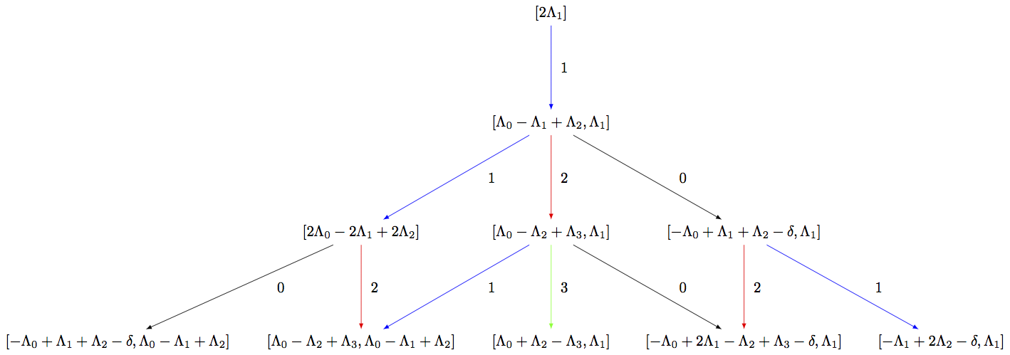 Since the affine highest weight crystals are infinite, it is not possible to list all elements or draw the entire crystal graph. However, if the user is only interested in the crystal up to a certain distance or depth from the highest weight element, then one can work with the corresponding subcrystal. To view the corresponding upper part of the crystal, one can build the associated digraph: